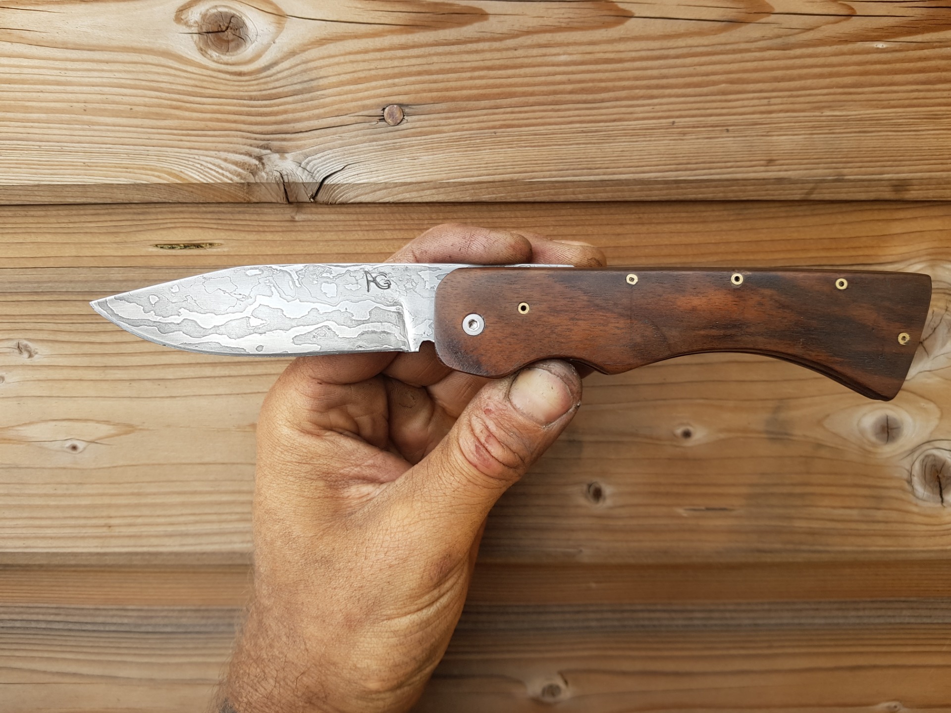 lame forgée en damas acier xc75 et 15n20 l'arrière de la lame fait office de décapsuleur manche en noyer